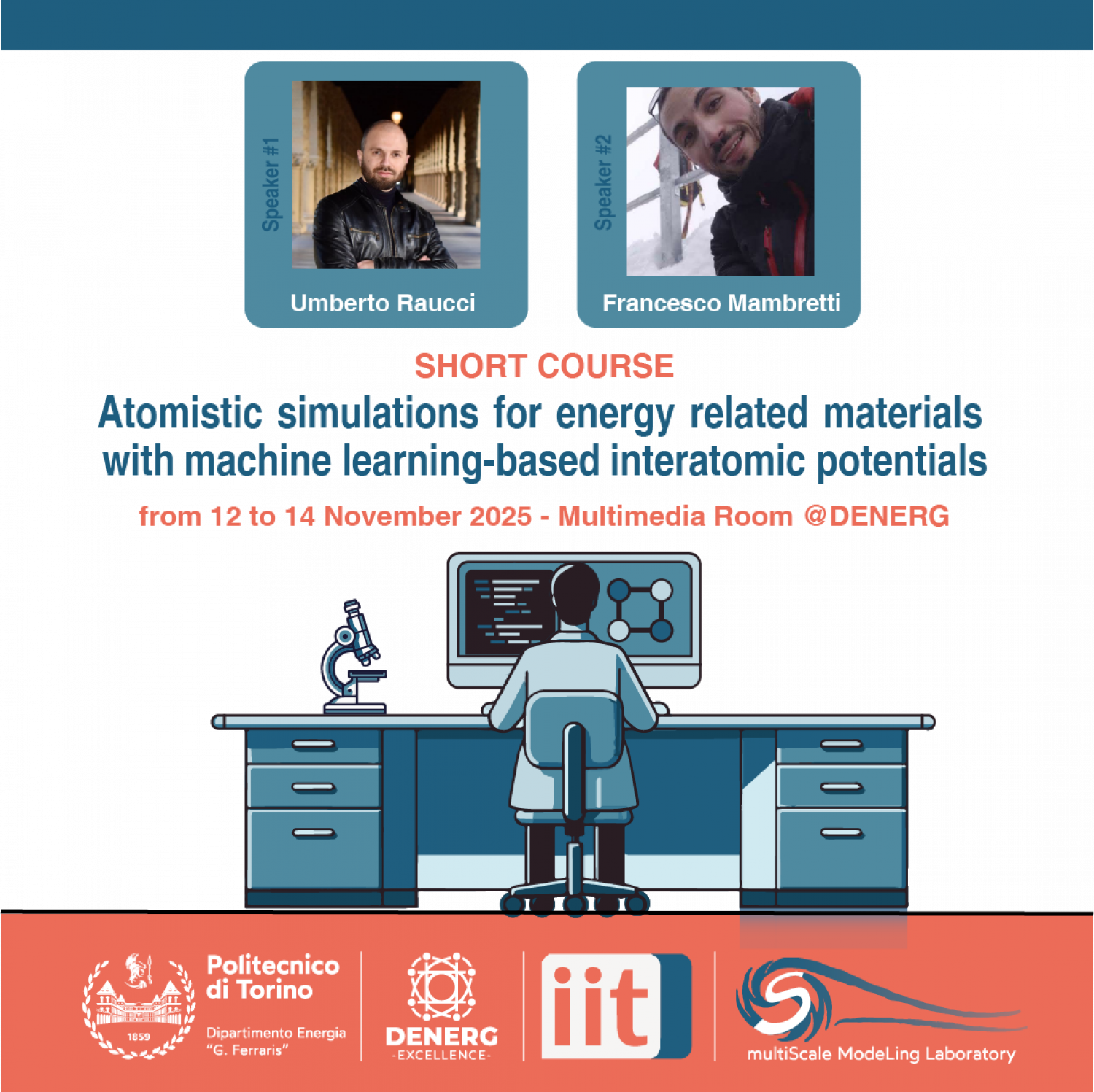 Discuteremo l’addestramento dei potenziali basati su Machine Learning, la raccolta dei dati necessari e i pro e i contro di ciascun metodo. Inoltre, il corso includerà applicazioni illustrative per approfondire la comprensione dei partecipanti sulla dinamica strutturale, la cinetica chimica e i fenomeni di trasporto nei sistemi energetici, con particolare attenzione a esempi specifici come gli effetti della temperatura sui materiali del catodo e le reazioni chimiche che coinvolgono catalizzatori.